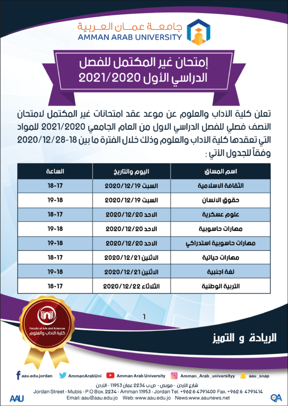 امتحان غير المكتمل للفصل الدراسي الأول 2020-2021 Posted on December 16, 2020December 16, 2020 by anas kaso Related Post والدة الدكتور محمد بن طريف في ذمة الله شقيقة الأستاذ الدكتور خالد الطراونة في ذمة الله “عمان العربية” والملحقية اليمنية تبحثان التعاون المشترك تشكيلات أكاديمية في “عمان العربية” مشروع تخرج لطالبة هندسة العمارة في “عمان العربية” امتحان غير المكتمل للفصل الدراسي الأول 2020-2021