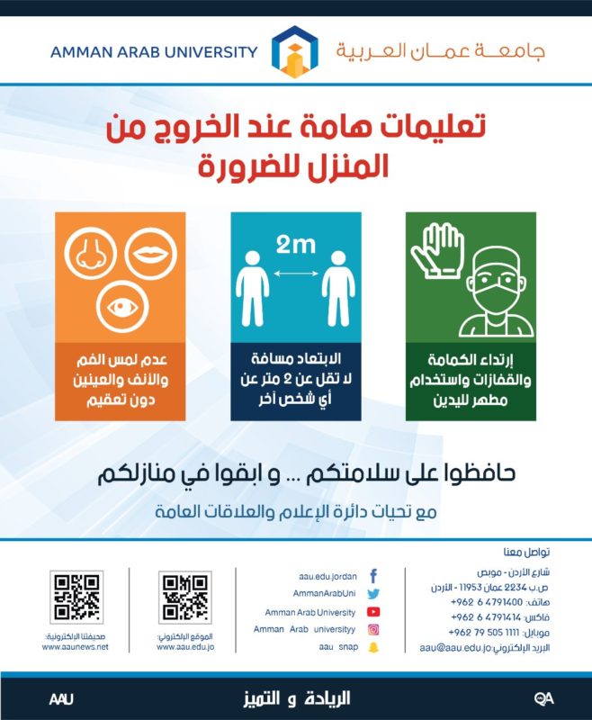 تعليمات هامة عند الخروج من المنزل للضرورة Posted on March 28, 2020March 28, 2020 by jameeleh Related Post والدة الدكتور محمد بن طريف في ذمة الله شقيقة الأستاذ الدكتور خالد الطراونة في ذمة الله “عمان العربية” والملحقية اليمنية تبحثان التعاون المشترك تشكيلات أكاديمية في “عمان العربية” مشروع تخرج لطالبة هندسة العمارة في “عمان العربية”