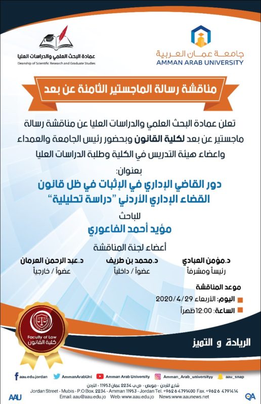 مناقشة رسالة الماجستير الثامنة عن بعد Posted on April 23, 2020April 23, 2020 by jameeleh Related Post والدة الدكتور محمد بن طريف في ذمة الله شقيقة الأستاذ الدكتور خالد الطراونة في ذمة الله “عمان العربية” والملحقية اليمنية تبحثان التعاون المشترك تشكيلات أكاديمية في “عمان العربية” مشروع تخرج لطالبة هندسة العمارة في “عمان العربية” على الرابط الآتي: https://zoom.us/j/91522809761?pwd=SGk0M1Z3eVNUSGRKVEErQ2sxcStsUT09
