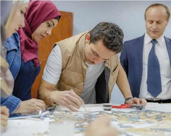 وشارك سموه طلبة المعهد بإعداد لوحة فسيفسائية، مثلما تجول في أقسام المعهد الذي يقدم برنامج الدبلوم الوحيد من نوعه في المنطقة في إنتاج وترميم الفسيفساء والحفاظ عليها، ويمنح شهادة معتمدة من جامعة البلقاء التطبيقية.